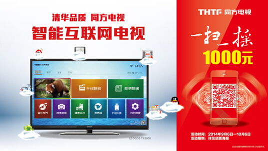 為了迎接十一,清華同方電視舉辦了“清華品質(zhì) 同方電視智能互聯(lián)網(wǎng)電視 一掃一搖1000元”給力促銷(xiāo)活動(dòng)。活動(dòng)期間凡購(gòu)買(mǎi)同方電視者,憑借購(gòu)買(mǎi)發(fā)票和登記表均可參與搖獎(jiǎng),獎(jiǎng)品包括:1000元/800元/500元/200元/300元1號(hào)店電子購(gòu)買(mǎi)券或充值卡,100%
