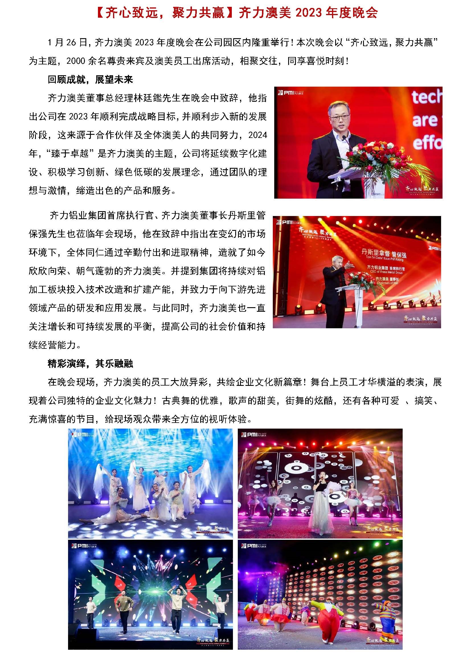2024. 03. 11齊力澳美,揚(yáng)帆遠(yuǎn)航!3月10日晚,齊力澳美2023年春茗晚會在佛山隆重舉行,齊力鋁業(yè)集團(tuán)領(lǐng)導(dǎo),合作伙伴以及齊力澳美全體員工悉數(shù)出席,見證公司全新篇章的華麗開啟。踔厲奮發(fā)·共譜新篇晚會的開篇通過視頻詮釋了齊力澳... -