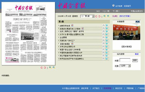 | 產(chǎn)品簡介: 中國企業(yè)新聞網(wǎng)在深入分析企業(yè)內(nèi)刊展現(xiàn)狀的基礎(chǔ)上,充分考慮互聯(lián)網(wǎng)用戶的閱讀習(xí)慣、交流互動等特點,自主研發(fā)了新的企業(yè)內(nèi)刊上網(wǎng)解決方案——企業(yè)內(nèi)刊聯(lián)展,企業(yè)內(nèi)刊聯(lián)展是指通過企業(yè)快報軟件,將企業(yè)內(nèi)刊原汁原味的展現(xiàn)在互聯(lián)網(wǎng)上,是一套報業(yè)專業(yè)的網(wǎng)站發(fā)布系統(tǒng),使廣大讀者能夠全面、直觀、生動地與最新出版的企業(yè)內(nèi)刊進行近距離接觸。 1、信息傳播快捷:在每期內(nèi)刊排版完成的同時即可發(fā)布網(wǎng)絡(luò)內(nèi)刊,省會了傳統(tǒng)內(nèi)刊所需的印刷,發(fā)行的時間,使內(nèi)刊的時效性更強。 2、覆蓋面廣泛:企業(yè)內(nèi)刊上網(wǎng),它的載體是互聯(lián)網(wǎng),面對的中國網(wǎng)民是1.2億,還不包括國外的瀏覽群體,為企業(yè)的內(nèi)刊傳播提供了廣闊的舞臺。通過企業(yè)快報發(fā)布企業(yè)內(nèi)刊,任何人只要能上網(wǎng),就能閱讀到刊物上的信息,內(nèi)刊不再是企業(yè)內(nèi)部發(fā)行、行業(yè)內(nèi)部發(fā)行,而是做到全球發(fā)行。 3、信息檢索方便:網(wǎng)絡(luò)通過超文本鏈接方式,將企業(yè)內(nèi)刊無限豐富的信息加以貯存和發(fā)布,用戶可以很方便地輸入關(guān)鍵詞進行資料檢索,迅速查找到相關(guān)新聞和圖片,使得信息資源的共享和再利用成為可能。 4、內(nèi)容的互動性增強:通過在線評論、郵件等方式讓信息不再單向傳播,通過讀編的互動形成一個促進內(nèi)刊不斷發(fā)展進步的良性循環(huán)。